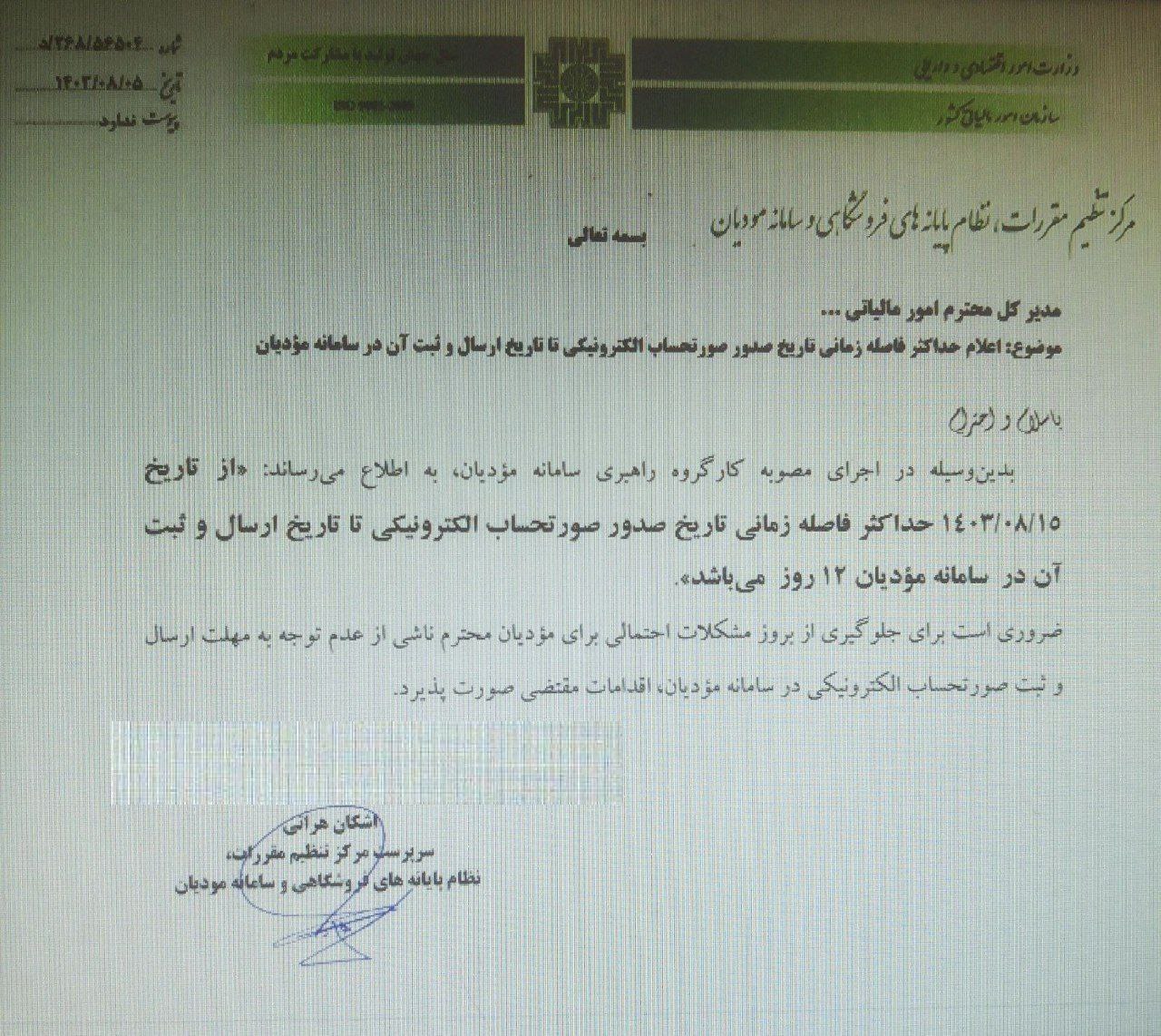 بدین وسیله در اجرای مصوبه کارگروه راهبری سامانه مؤدیان، به اطلاع میرساند «از تاریخ ۱٤۰۳/۰۸/۱۵ حداکثر فاصله زمانی تاریخ صدور صورتحساب الکترونیکی تا تاریخ ارسال و ثبت آن در سامانه مؤدیان ۱۲ روز میباشد.»